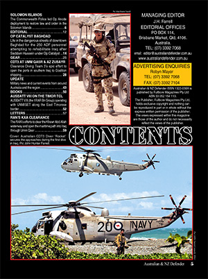 Exercise Crocodile 2003 at SWBTA, Bougainville Mission Ends, Kiwis Deploy to Iraq, ADF Reserve Response Force Raised, AW-50F AMR in Service, US Navy SEALs train in Sydney, Kiwi LAVIII Vehicles Enter Service.