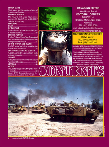 IRAQ: Op Bastille-the ADF build up to the Iraq War, RAN Ops in the North Arabian Gulf, Op Catalyst, Op Falconer. AUSBATT VII Contact in East Timor, RAN & SF Interception of North Korean Ship Pong Su, Successful Kalkara Missile Ex, Leopard Tank Night Viewer.
